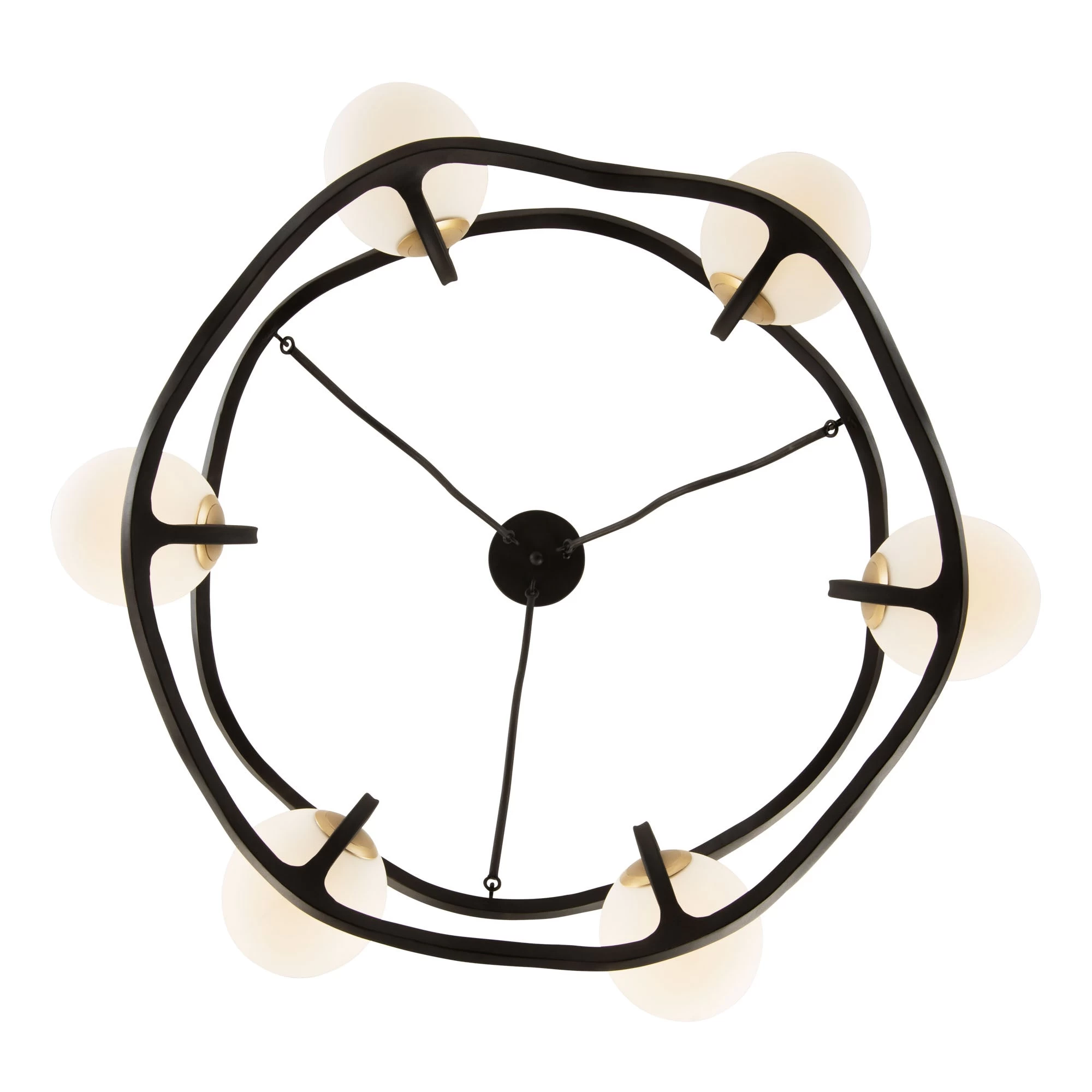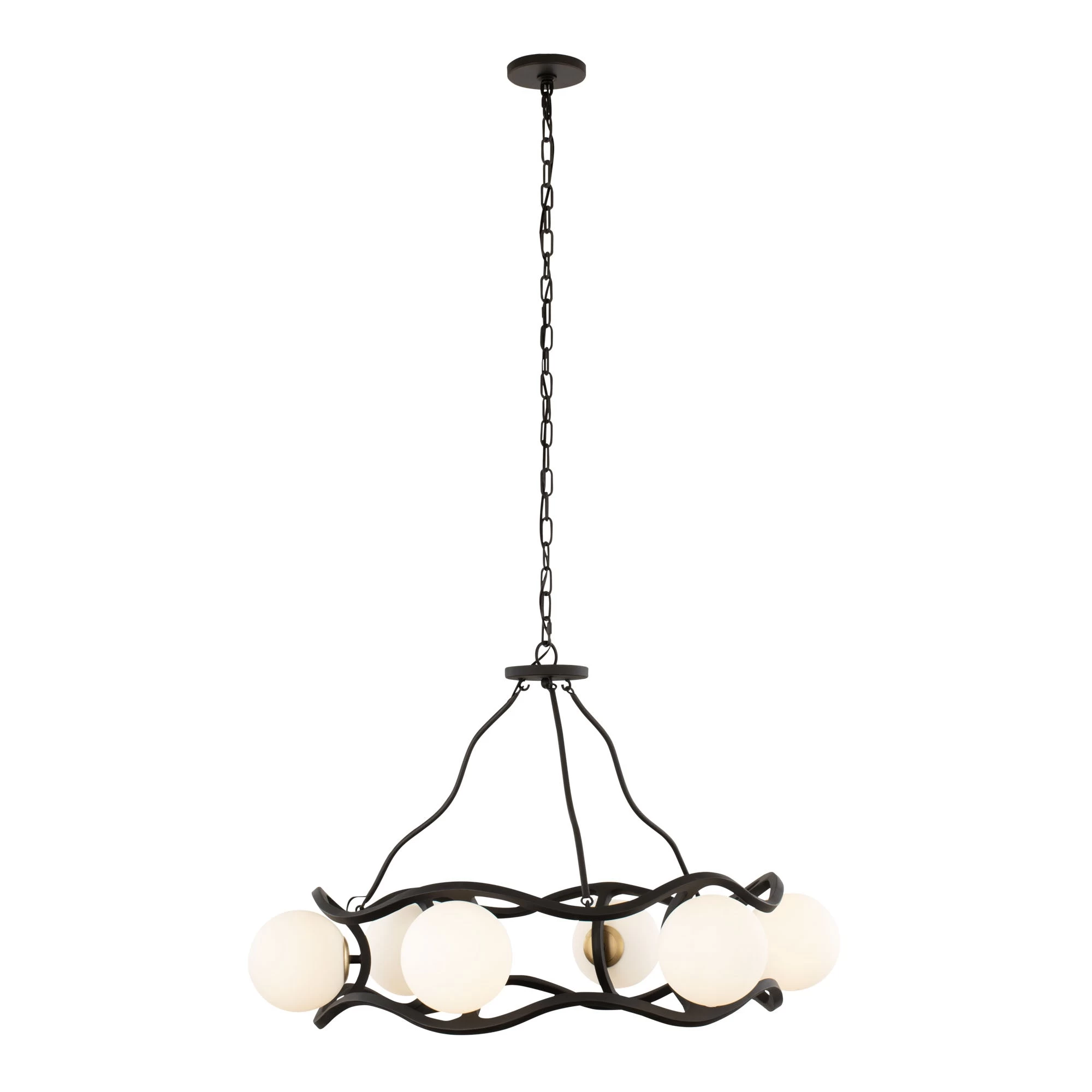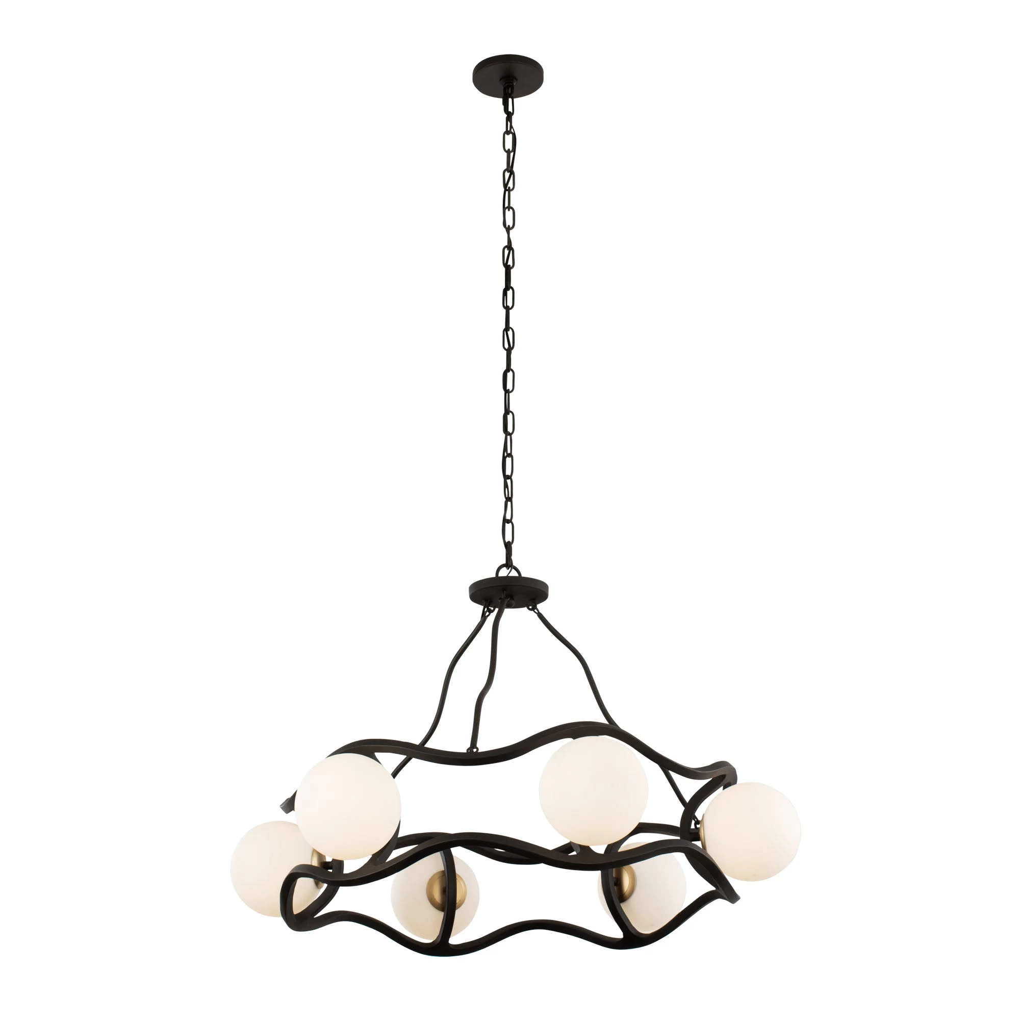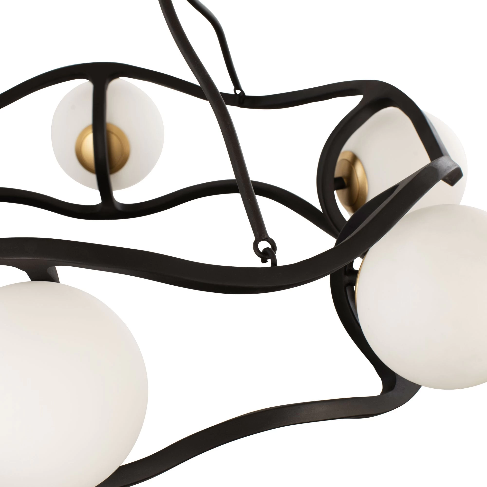 Elaborately Handcrafted Black Metal Work. Opal White Glass Globes. Carbon Black with French Gold Accents