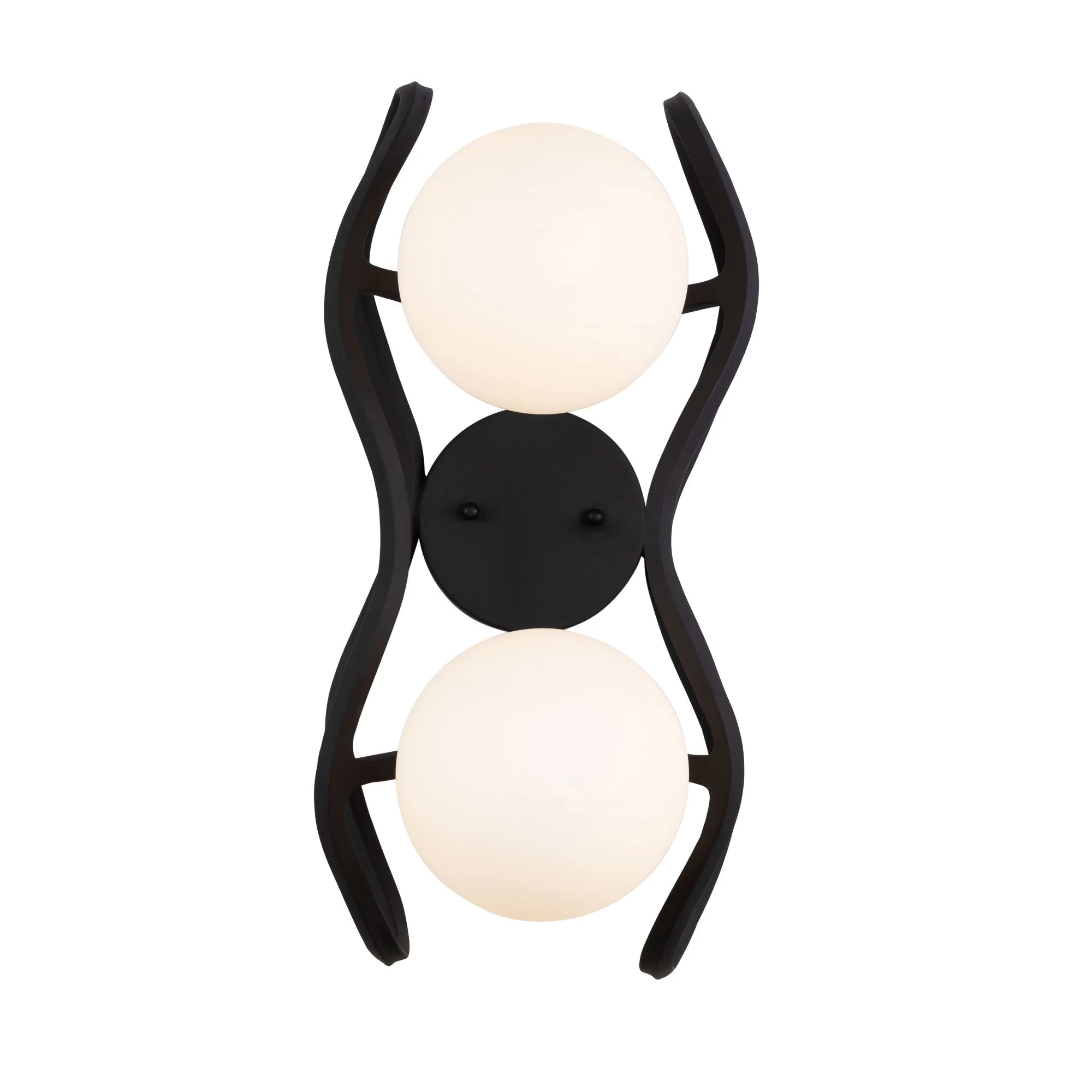 Elaborately Handcrafted Black Metal Work. Opal White Glass Globes. Carbon Black with French Gold Accents