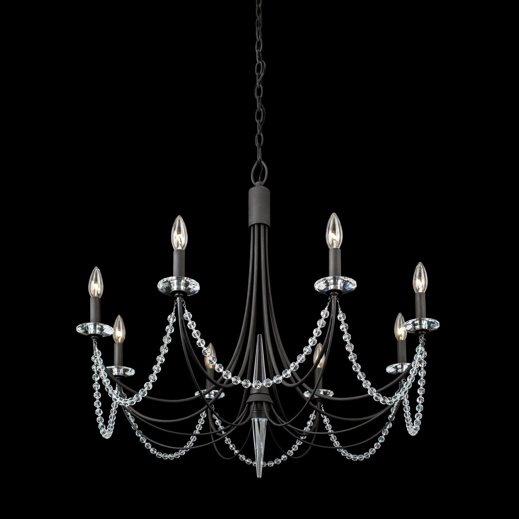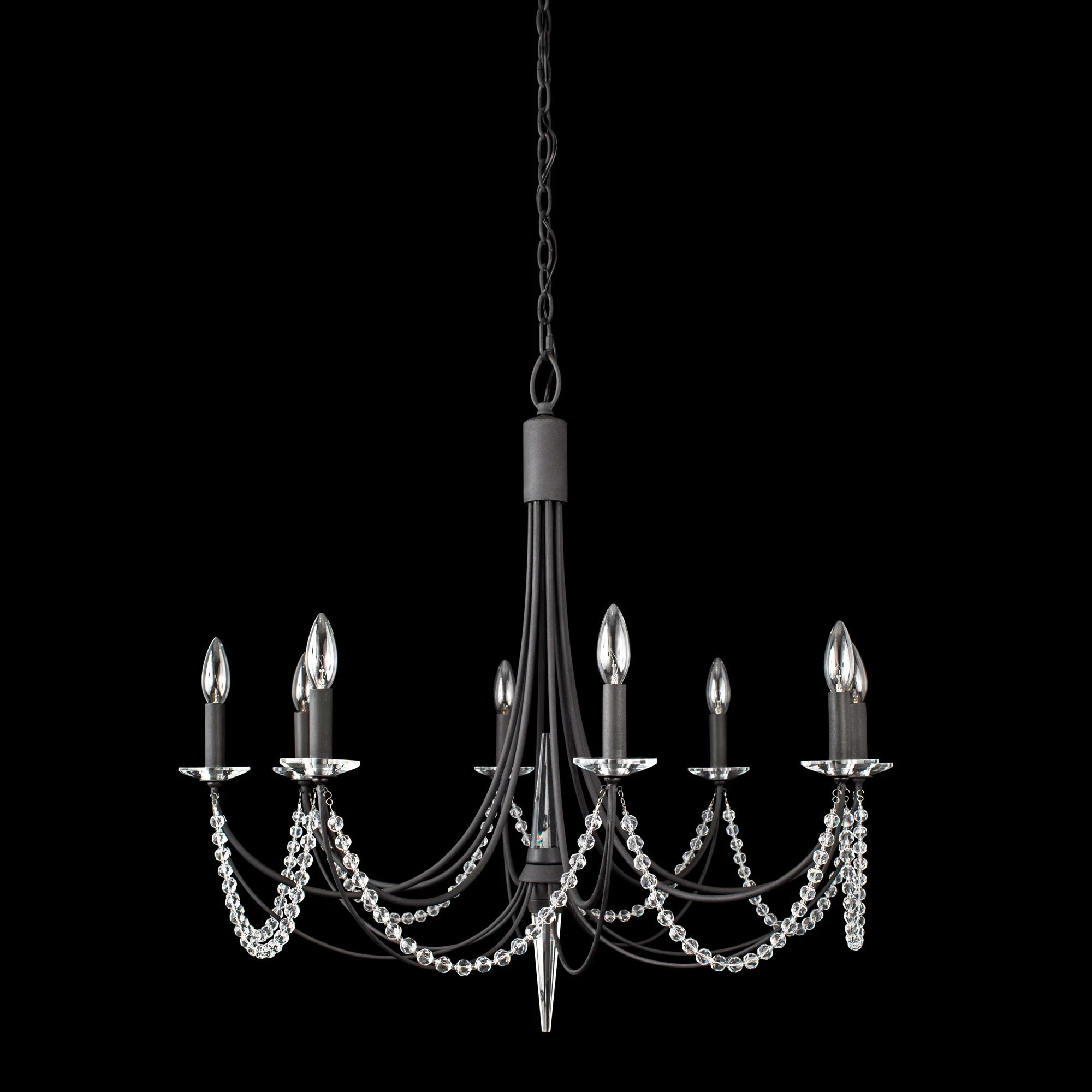 Inspired by an old Williamsburg chandelier. Brentwood is finished in French Gold and Carbon Black. Draped in bohemian crystals and dressed in K9 crystals spears and bebeches.