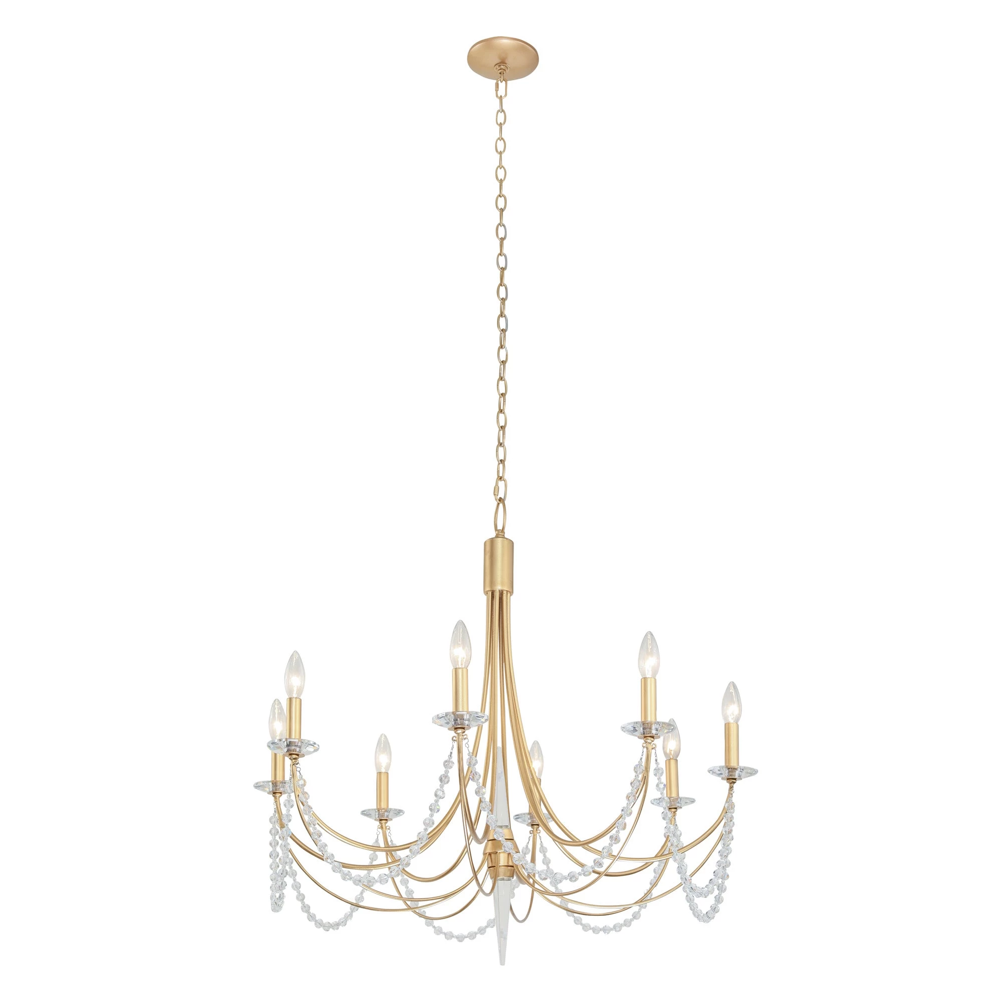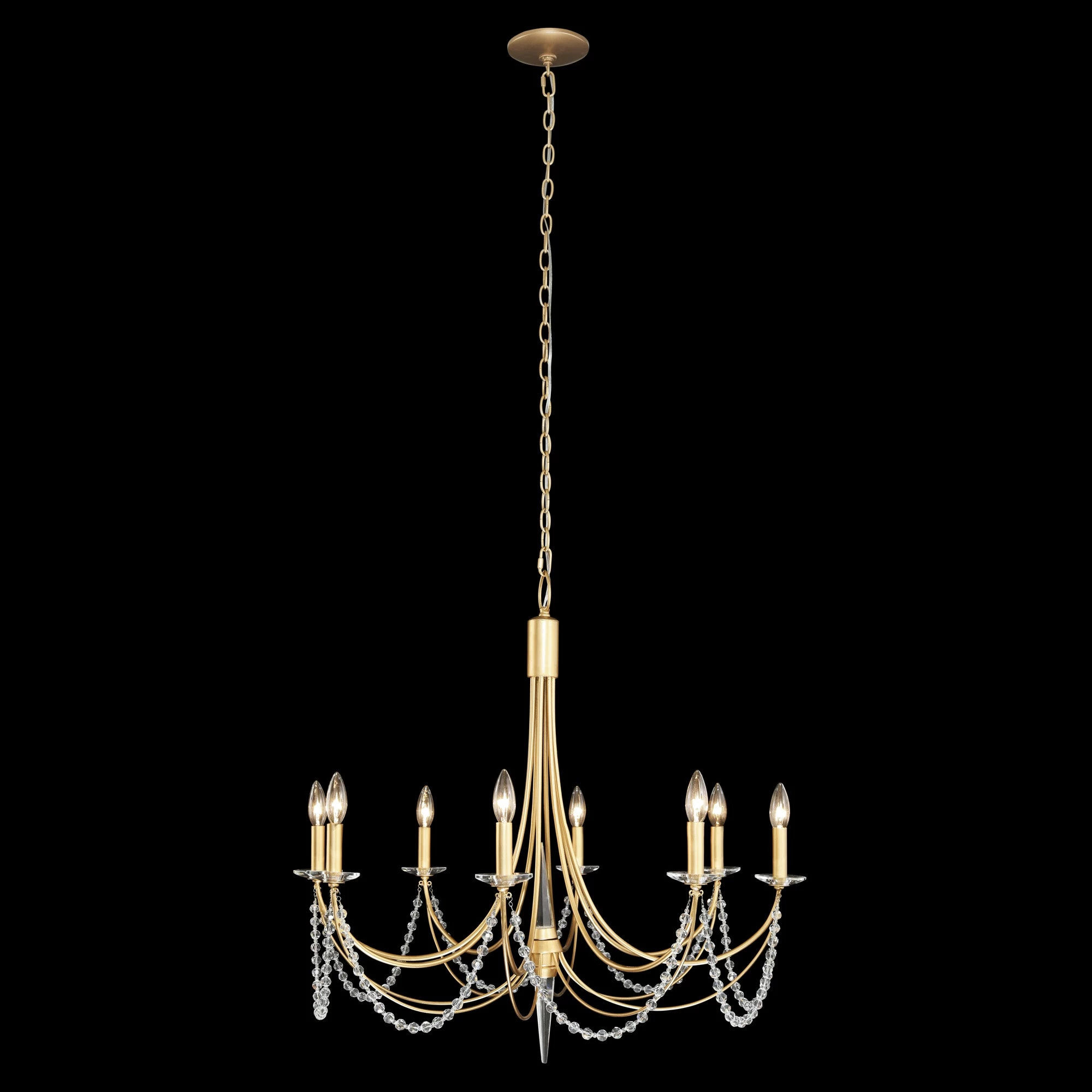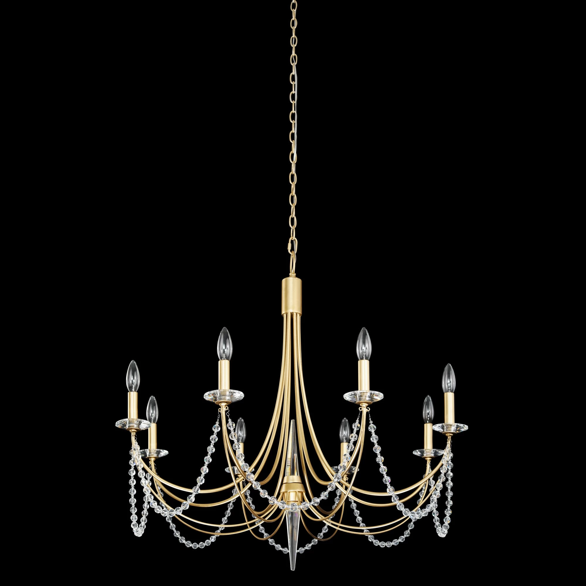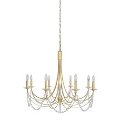 Inspired by an old Williamsburg chandelier. Brentwood is finished in French Gold and Carbon Black. Draped in bohemian crystals and dressed in K9 crystals spears and bebeches.