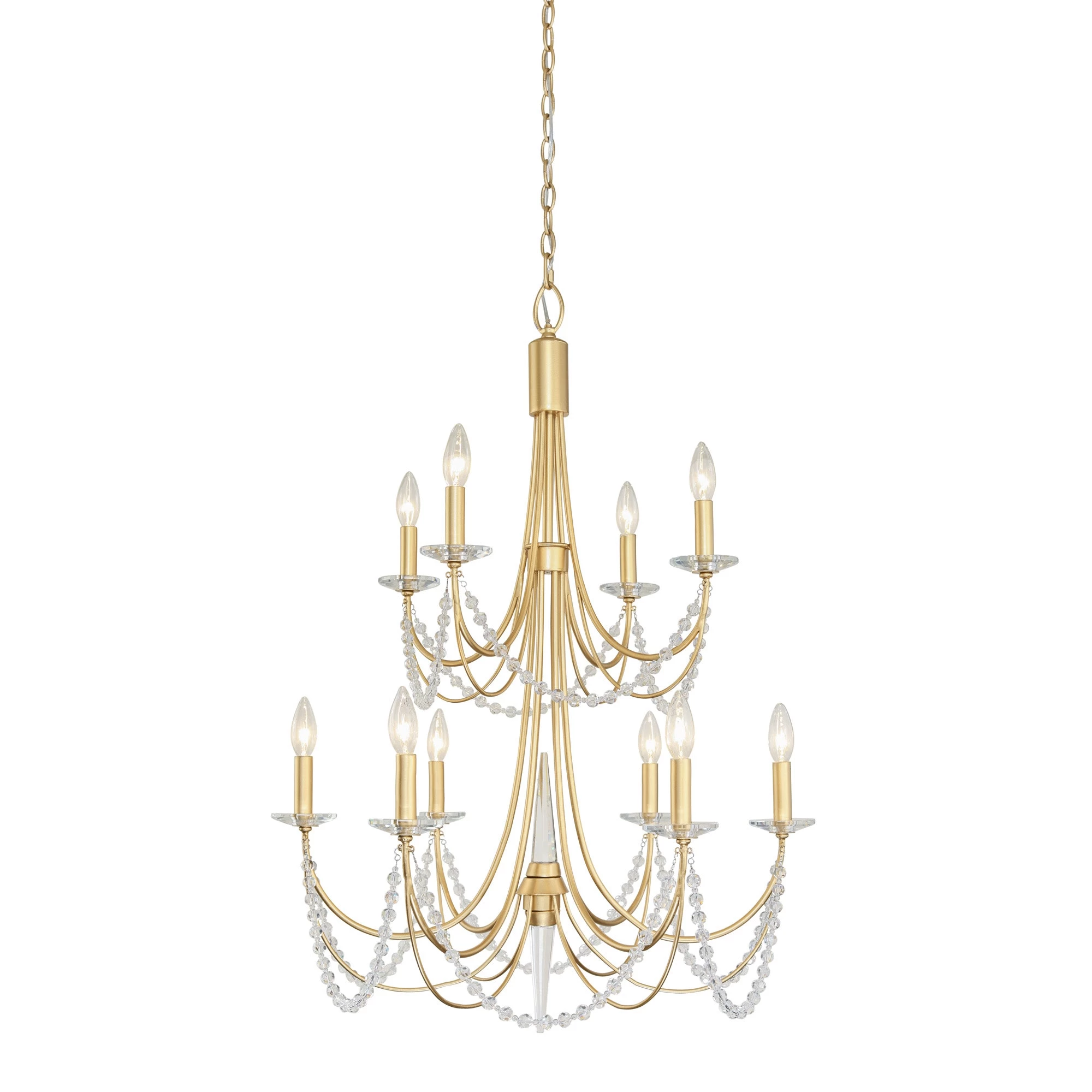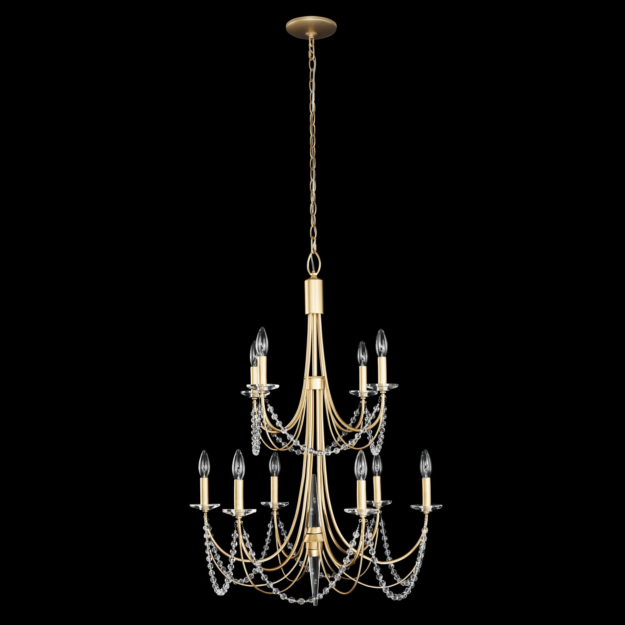 Inspired by an old Williamsburg chandelier. Brentwood is finished in French Gold and Carbon Black. Draped in bohemian crystals and dressed in K9 crystals spears and bebeches.