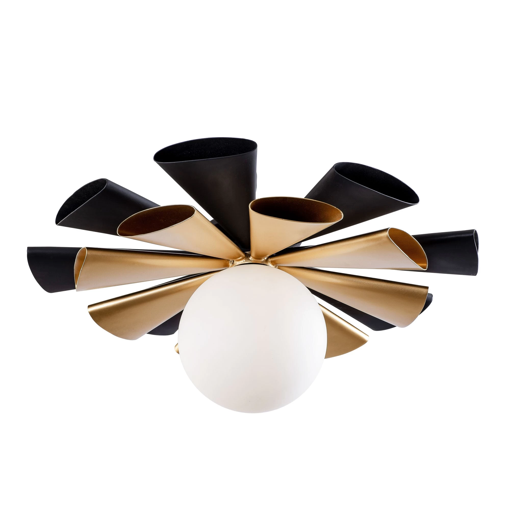 Hand-forged Tapered Oval Tubing. Hand-applied Matte Black and French Gold. Recycled Opal White Glass Globe